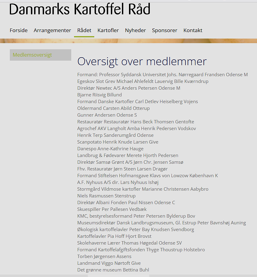 Bannerbillede: Danmarks Kartoffel Råd har en stor bestyrelse af erhvervsfolk indenfor kartoffelbranchen, men ingen økologiske. Skærmbillede.