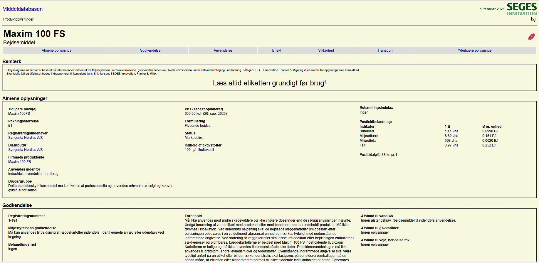 Det er svampemidlet Maxim 100 FS, vi taler om. Det bruges til at bejdse kartofler, og det er ikke sukkervand. Producenten Syngenta Nordic A/S er fuldt ud klar over giftigheden og ringer da også med den store alarmklokke på etiketten, hvor Syngenta advarer brugerne af sprøjtegiften med disse sætninger: