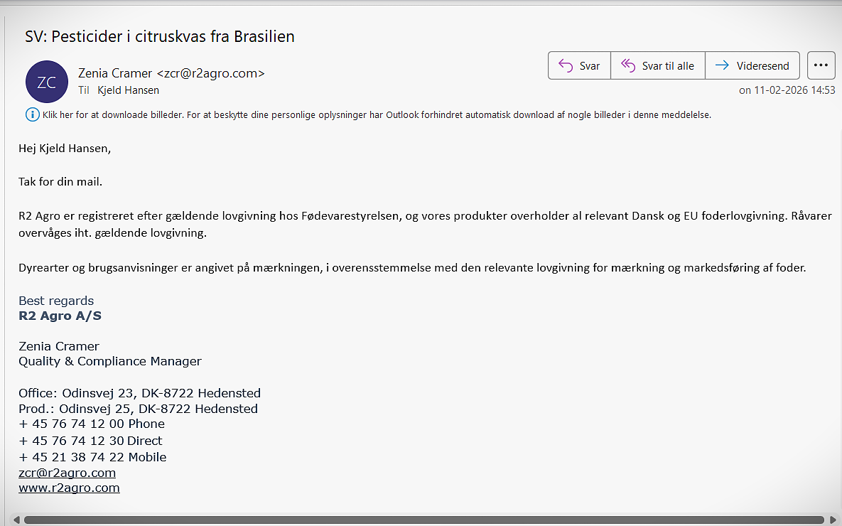Peter Skou har imidlertid ikke ønsket selv at besvare vores henvendelse, men overladt det til Zenia Cramer, der er Quality & Compliance Manager hos R2 AGRO. Cramer besvarer ikke spørgsmålene, men skriver bare: